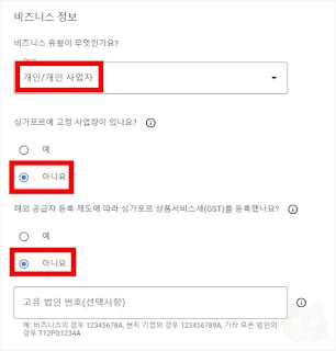 비즈니스 정보 입력란에는 개인/개인 사업자로 선택합니다. 그리고 싱가포르에 고정 사업장이 있을리가 없으니 아니요를 선택! 바로 아래의 싱가포르 상품서비스세도 당연히 등록한적이 없으니 아니요를 선택합니다.