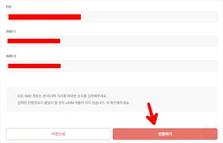 스마트폰의 EID, IMEI 값이 나오죠. 바코드와 함께요. 스크린샷을 하여 캡쳐한 이미지 올리기 버튼을 눌러서 스샷한 이 이미지를 업로드하면 자동으로 값을 인식하게 됩니다.